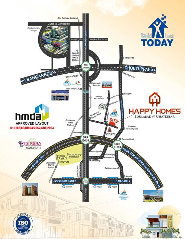 HAPPY HOMES is a well-planned residential layout near Ghatkesar, designed with world-class amenities, superior infrastructure, and excellent connectivity. With wide CC roads, modern facilities, abundant greenery, and rapid development in the surrounding region, it offers a perfect blend of investment value and peaceful living.